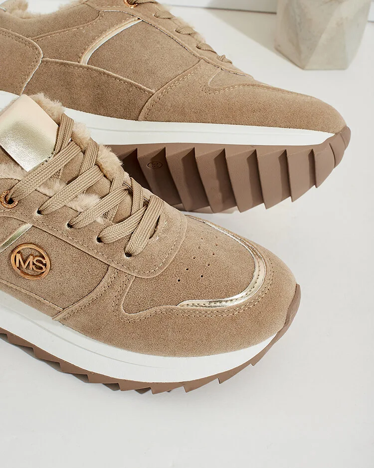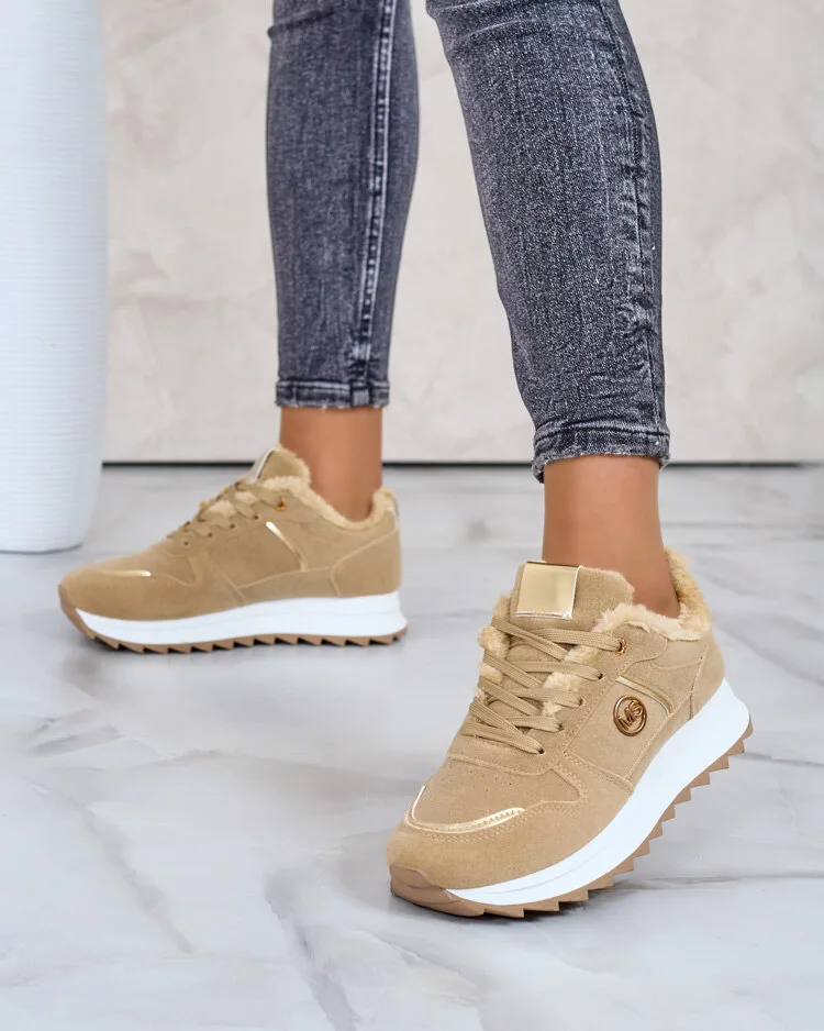 - Adidași sport pentru femei pe o talpă mai groasă. Partea superioară cu șireturi, din nubuc ecologic. Interior complet izolat cu blană. Ideali pentru zilele mai reci!