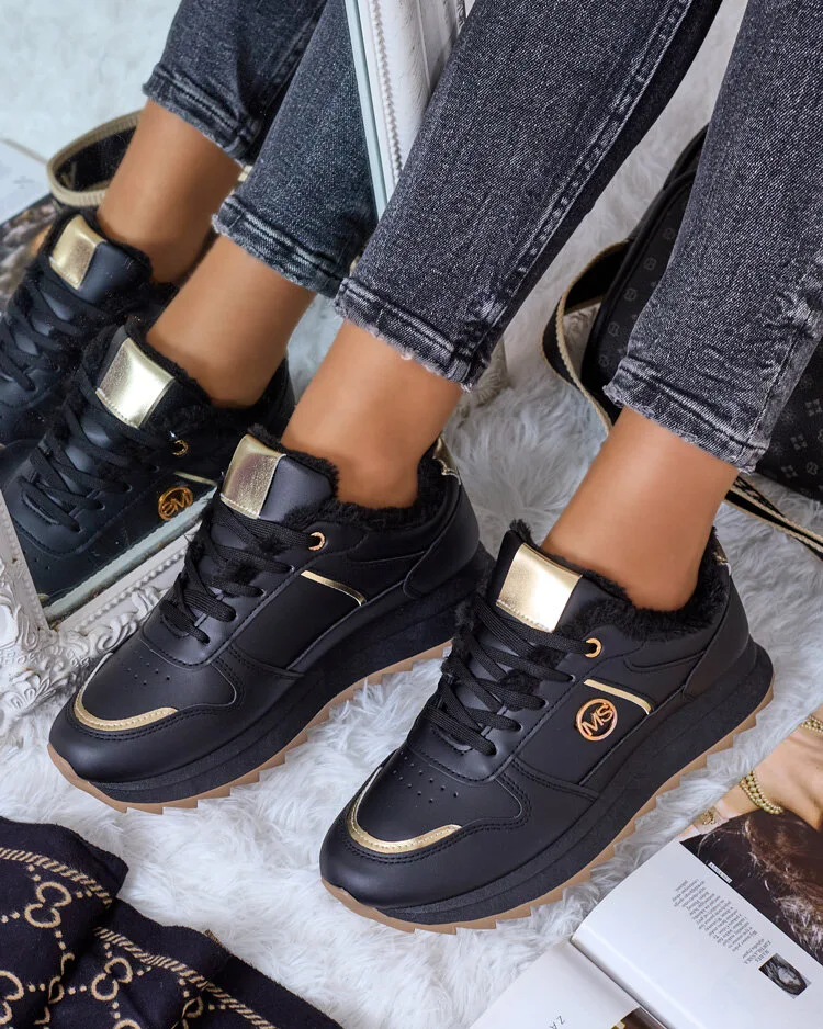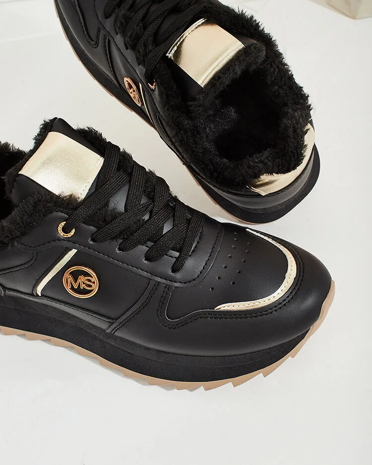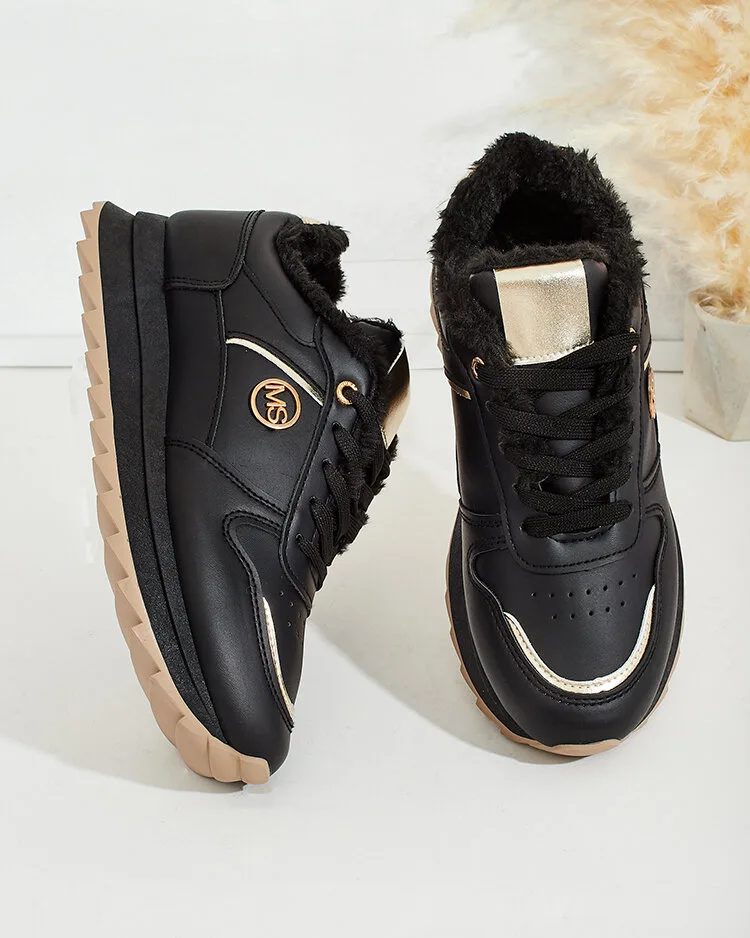 - Adidași sport de damă pe o talpă mai groasă. Partea superioară cu șiret, din piele ecologică. Interior complet izolat cu blană. Ideali pentru zilele mai reci!
