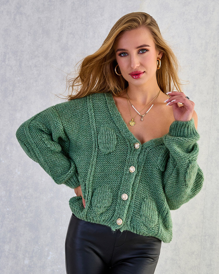 - Pulover pentru femei cu decolteu în formă de inimă, confecționat din material tricotat plăcut. Modelul are nasturi decorativi detașabili. O bază perfectă pentru zilele mai răcoroase!