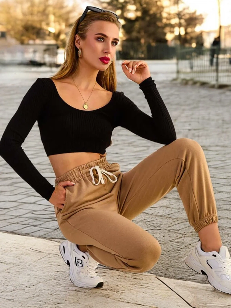 - Pantaloni de trening clasici realizați din țesătură moale și ușoară. Talia elastică largă vă permite să ajustați pantalonii la forma dvs. individuală. În plus, două buzunare glisante pe față.