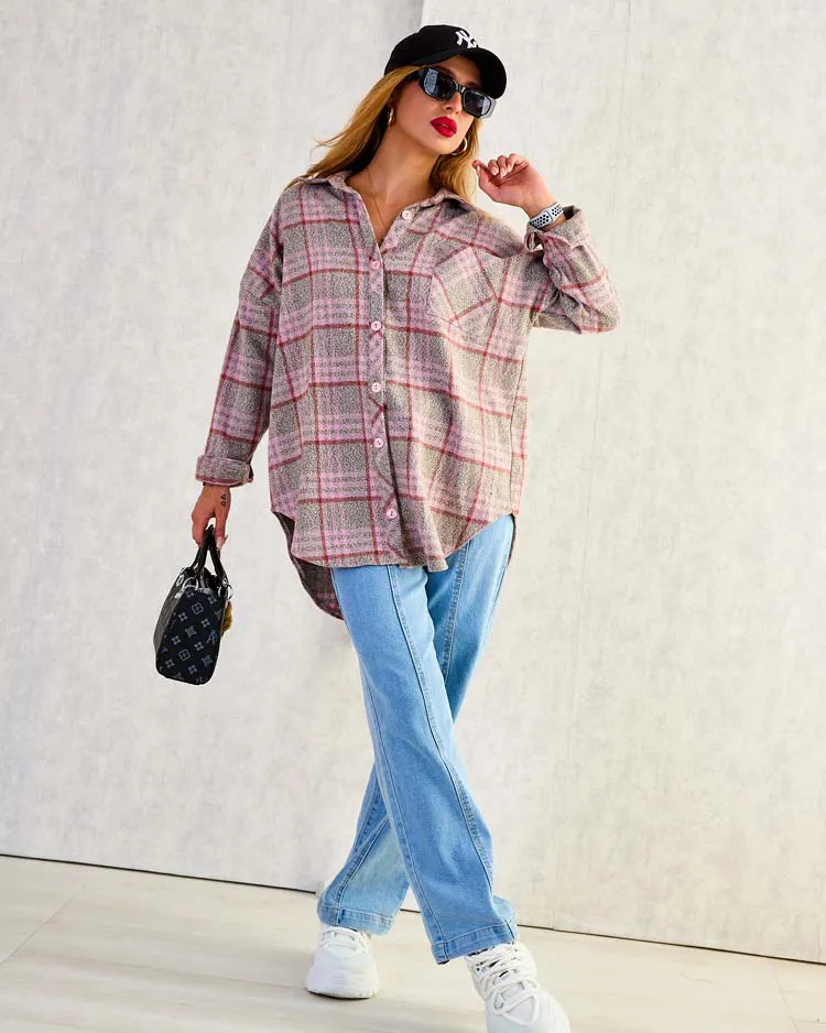 • Cămașă în carouri pentru femei cu croială supradimensionată, cu mâneci lungi, guler elegant și 1 buzunar. Ideală pentru toamnă!