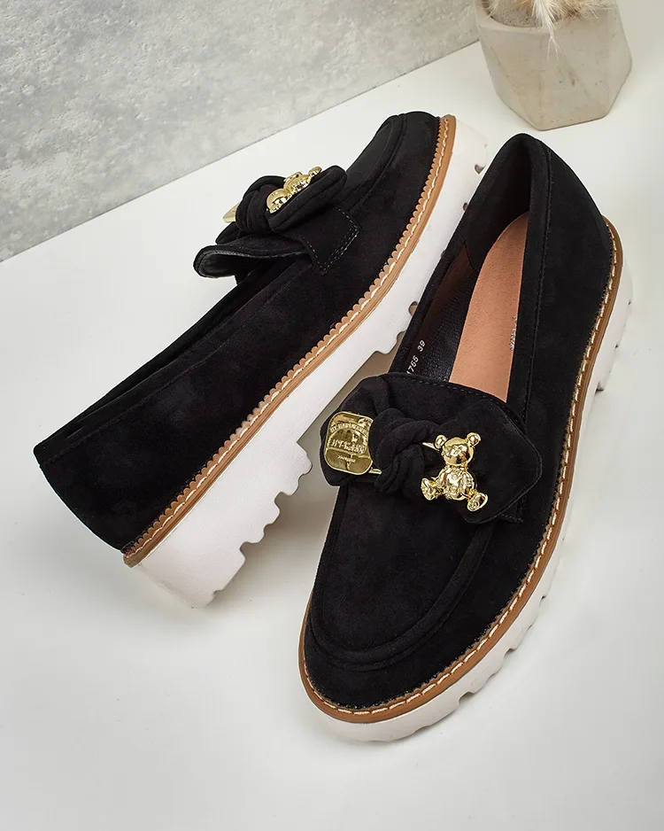 - Mocasini clasici de damă pe o platformă mică. Modelul este confecționat din piele ecologică de tip piele întoarsă și căptușeală din piele ecologică. Vârful este decorat cu o fundă. Un must-have în garderoba oricărei femei!