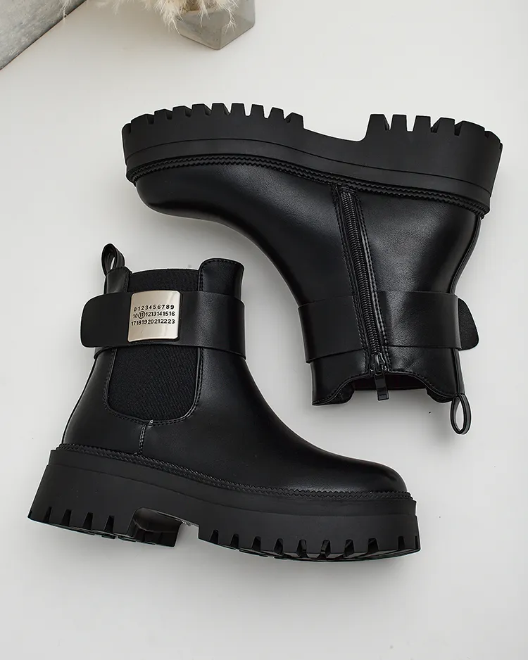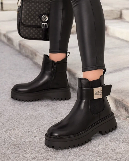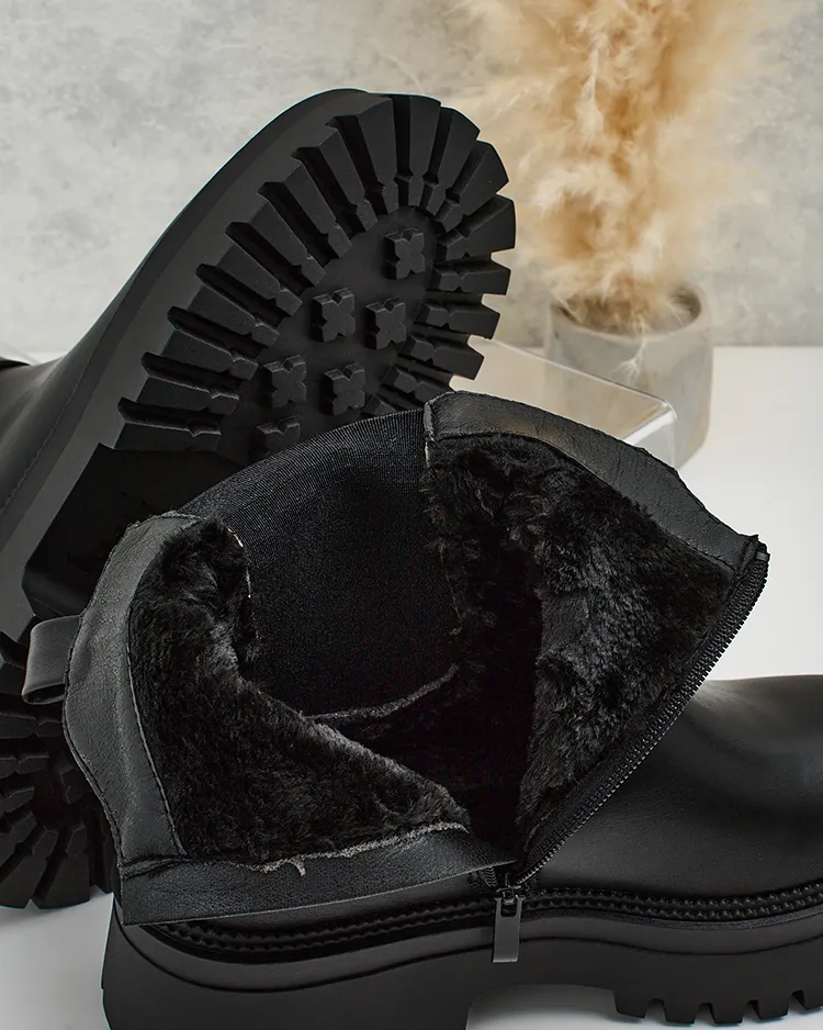 • Cizme pe o talpă mai groasă - stil și confort într-unul singur. Inserție elastică pe lateral și închidere cu fermoar pentru o purtare ușoară. Realizate în întregime din piele ecologică și talpă interioară din material textil. Acest model îți va da încrede