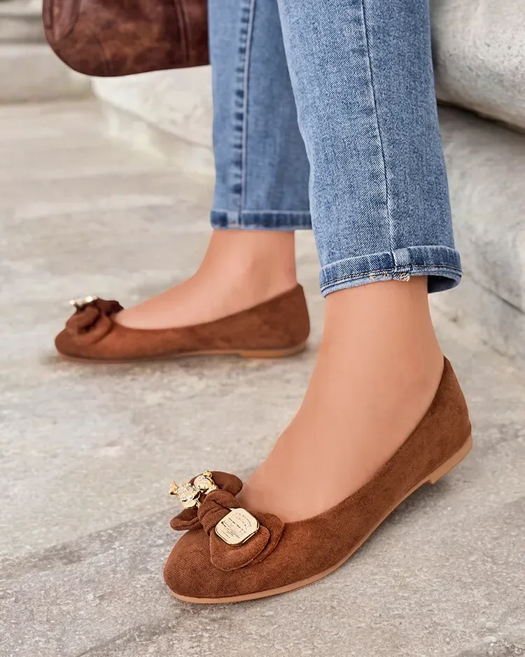 - Balerini cu toc plat pentru femei din piele ecologică de căprioară și talpă din piele ecologică. Modelul are un nas rotund cu o fundă decorativă. Super accesoriu pentru ținutele tale casual!