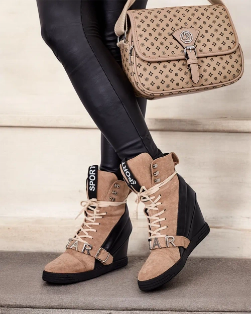 - Botine sport pentru femei pe toc, realizate dintr-o combinație de piele ecologică și piele ecologică. Pantofi legați cu decorațiuni pe partea superioară, talpă interioară din țesătură în interior.
