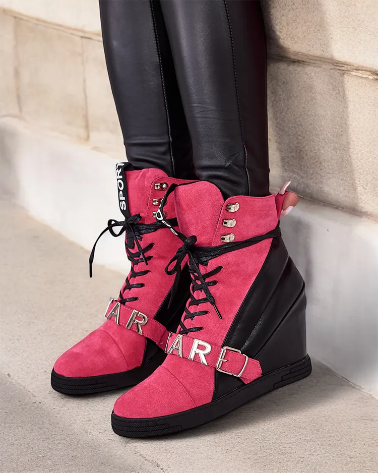 - Botine sport pentru femei pe toc, realizate dintr-o combinație de piele ecologică și piele ecologică. Pantofi legați cu decorațiuni pe partea superioară, talpă interioară din țesătură în interior.