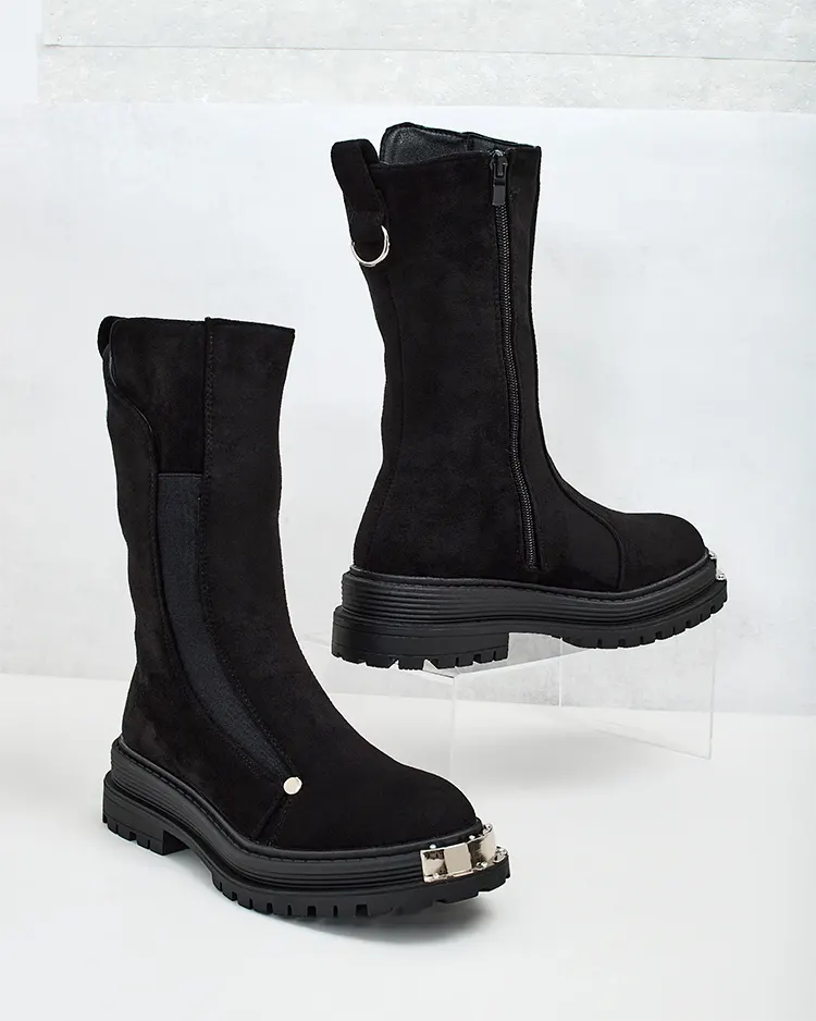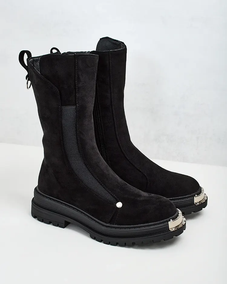 - Cizme înalte de damă pe talpă plată, din piele de căprioară ecologică. Interior căptușit cu blană moale, model cu fermoar. Ideale pentru toamnă!
