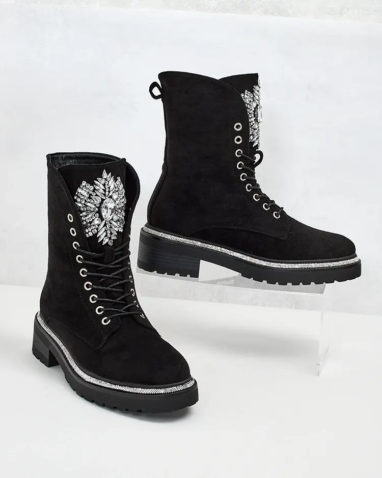 - Cizme elegante pentru bagger realizate din piele eco-suede. Pantofii sunt cu șireturi, au o talpă de cauciuc mai groasă și o talpă interioară din material textil. Pantofii au un ornament pe partea superioară. Perfect pentru toamnă!