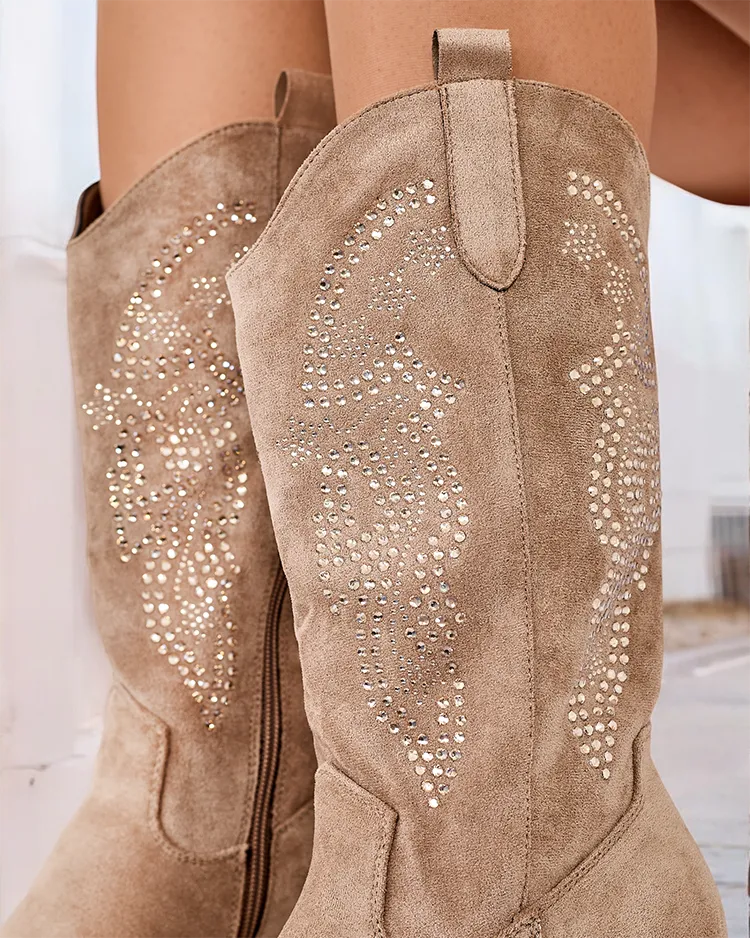 - Cizme a'la cizme de cowboy cu toc jos, realizate din piele ecologică de căprioară decorată cu zirconii. Interiorul este căptușit cu blană moale, cizme cu fermoar până la mijlocul vițelului. Se potrivesc la stilul multor femei!