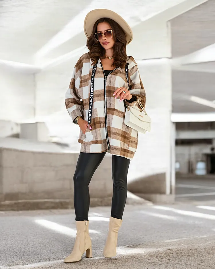 - Palton stilat tip cămașă pentru femei cu glugă. Haina tăiată supradimensionată are mâneci lungi, închidere cu fermoar și 2 buzunare. Grozav pentru toamnă!