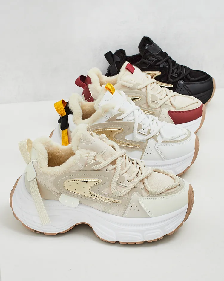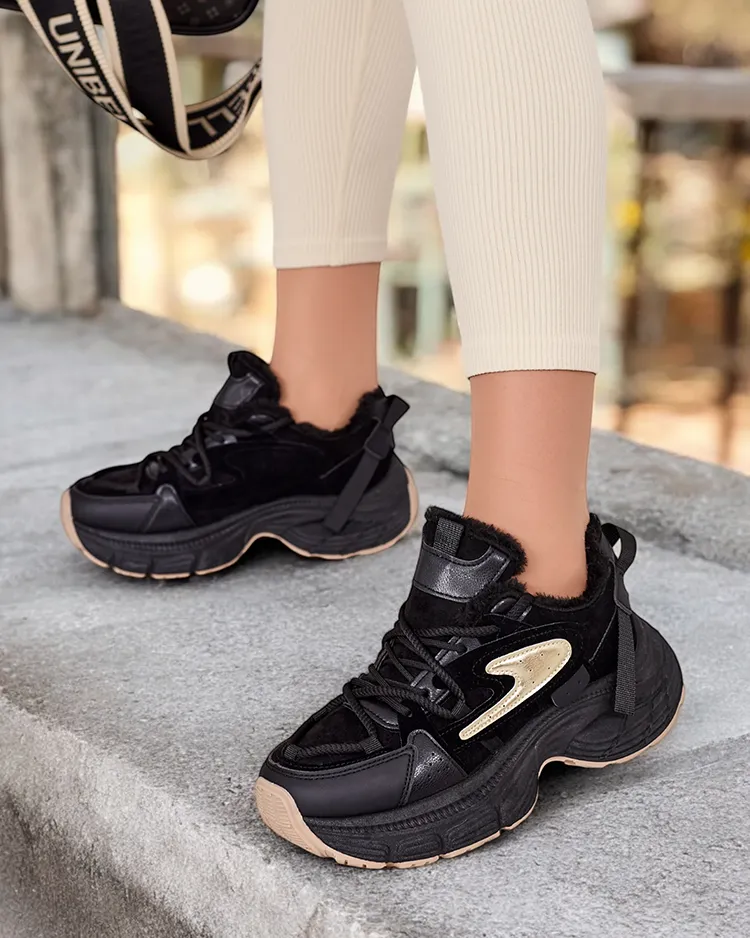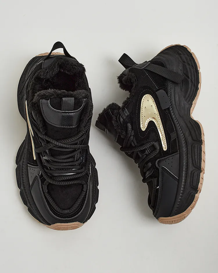 - Pantofi sport izolați pentru femei cu talpă mai groasă. Partea superioară cu șireturi din piele ecologică de căprioară cu elemente din piele ecologică. Blană moale în interior. Super accesoriu pentru ținutele tale casual de iarnă!