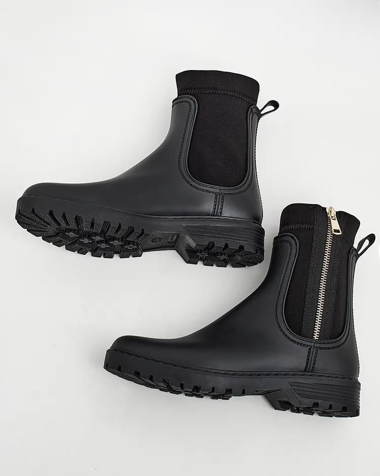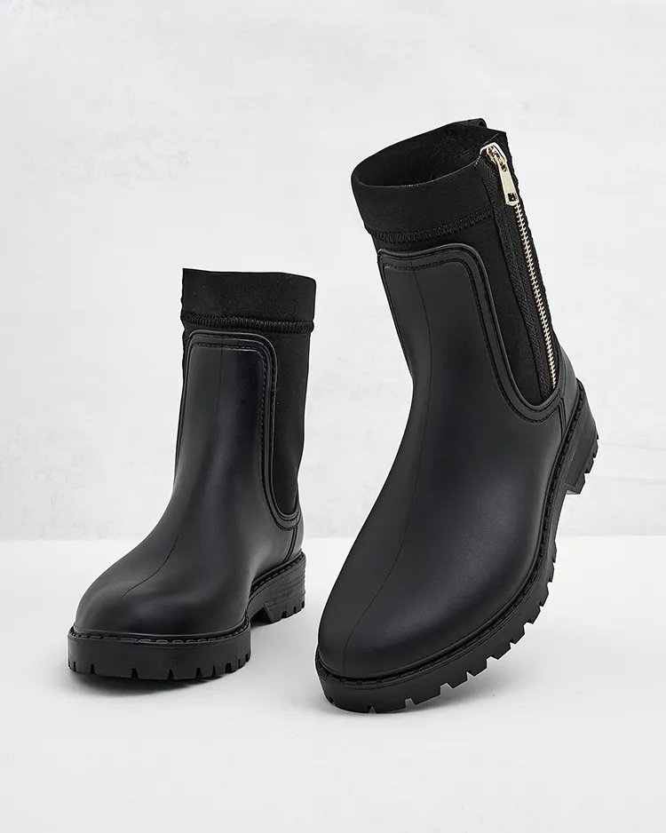 - Încălțăminte clasică pentru femei cu toc plat din material cauciucat. În interior există o talpă interioară din material textil. Au un fermoar decorativ. Ideale pentru zilele ploioase de toamnă!