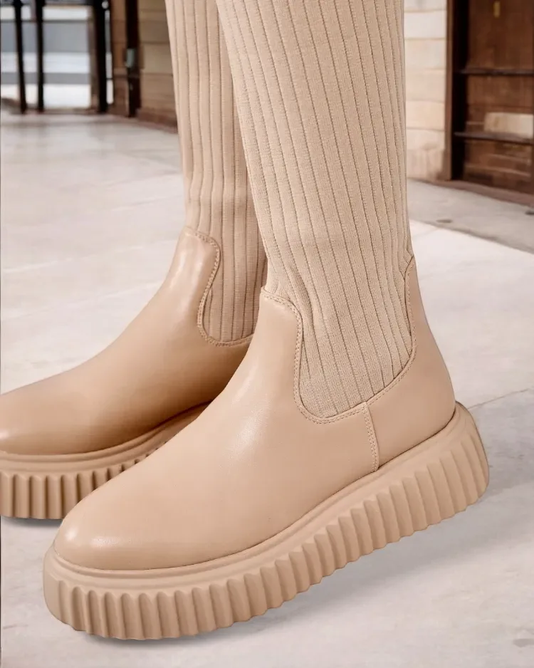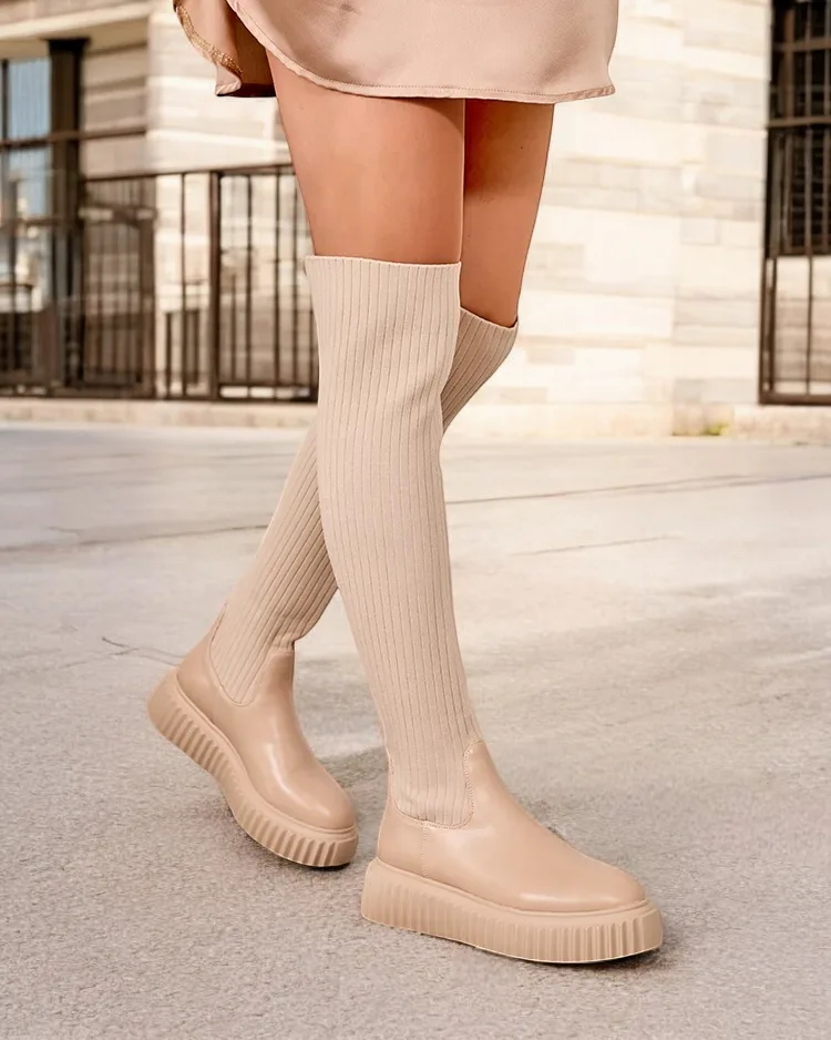 - Cizme peste genunchi elegante pentru femei pe o talpă mai groasă. Partea superioară este realizată din material textil elastic cu nervuri și are inserții din piele ecologică. Talpă interioară din blană. Model slip-on.