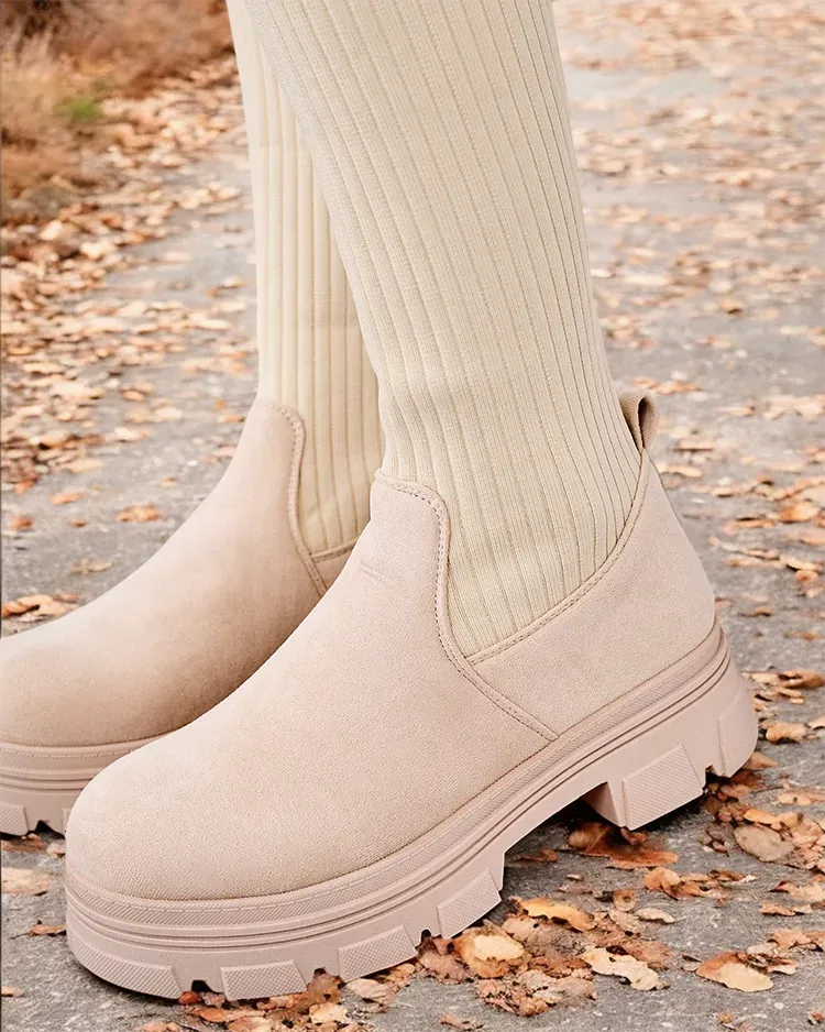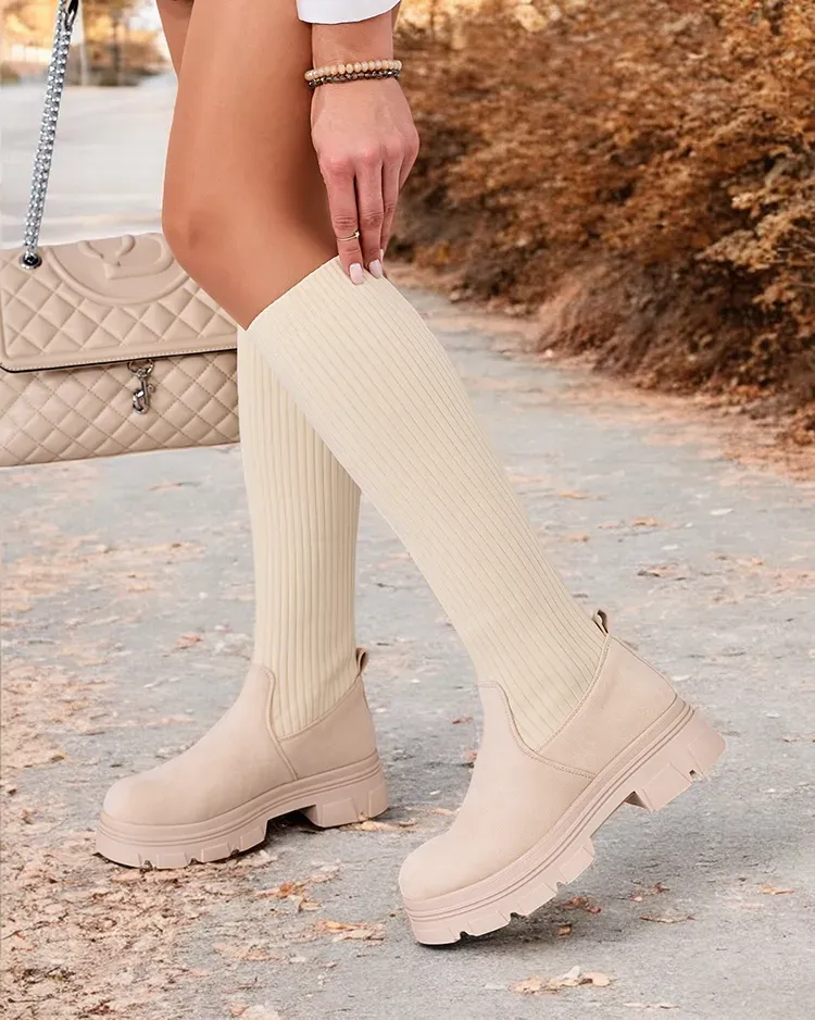 - Cizme elegante pentru femei până la genunchi cu toc plat. Partea superioară este realizată din material textil elastic combinat cu piele ecologică, talpă interioară din blană. Model slip-on. Perfecte pentru ținutele zilnice de toamnă!