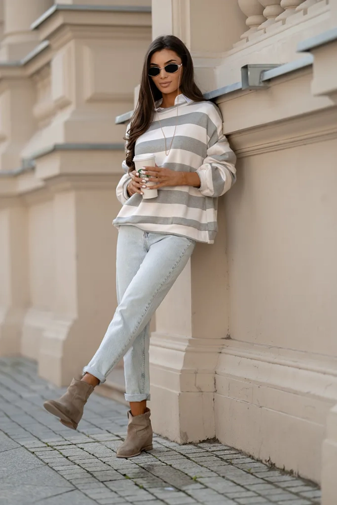 • Pulover de damă cu decolteu rotund, confecționat din țesătură plăcută cu model în dungi. Modelul are mâneci lungi. O bază perfectă pentru ținutele de iarnă!