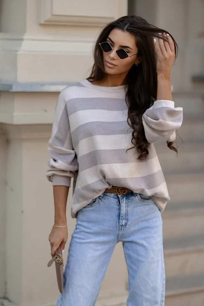 - Pulover de damă cu decolteu rotund, confecționat din țesătură plăcută cu model în dungi. Modelul are mâneci lungi. O bază perfectă pentru ținutele de iarnă!