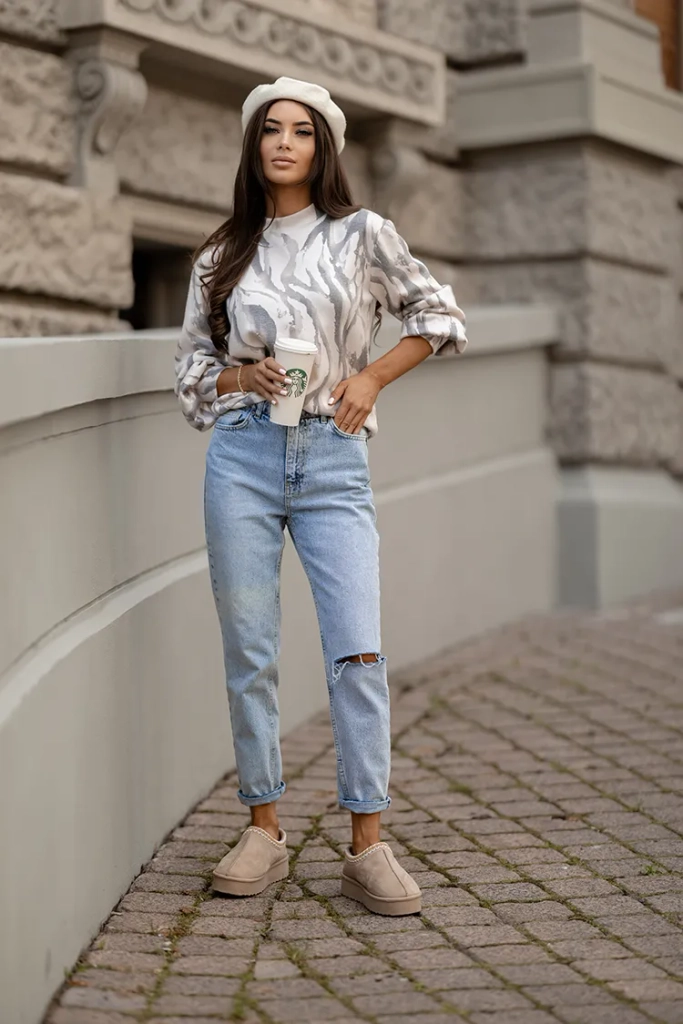 - Pulover de damă cu decolteu rotund din țesătură plăcută cu imprimeu. Modelul are mâneci lungi. Baza perfectă pentru ținutele de iarnă!