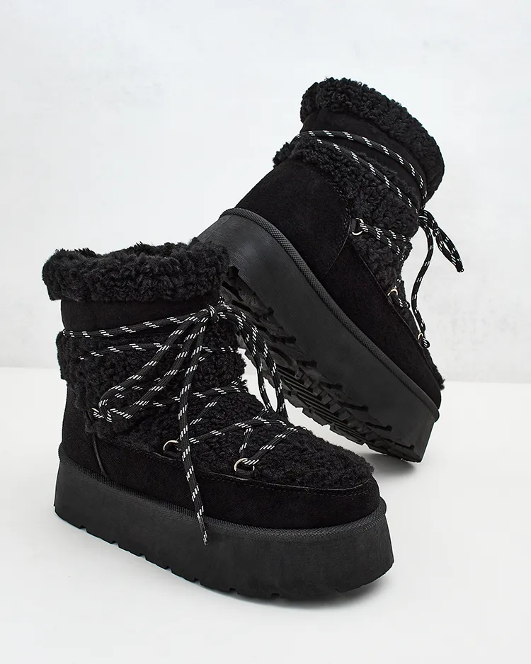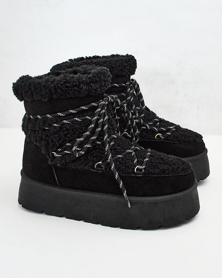 - Cizme de zăpadă pentru femei cu partea superioară realizată dintr-o combinație de piele de căprioară ecologică și material a' la oaie. Căptușite cu blană în interior, încălțăminte slip-on și cu șireturi. Perfecte pentru iarnă!