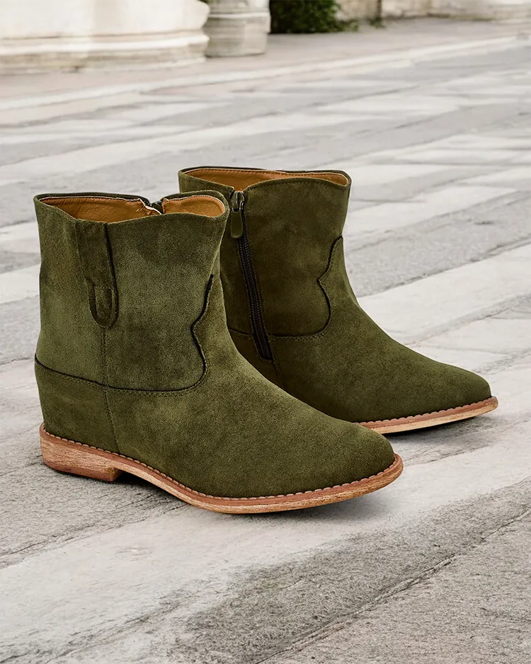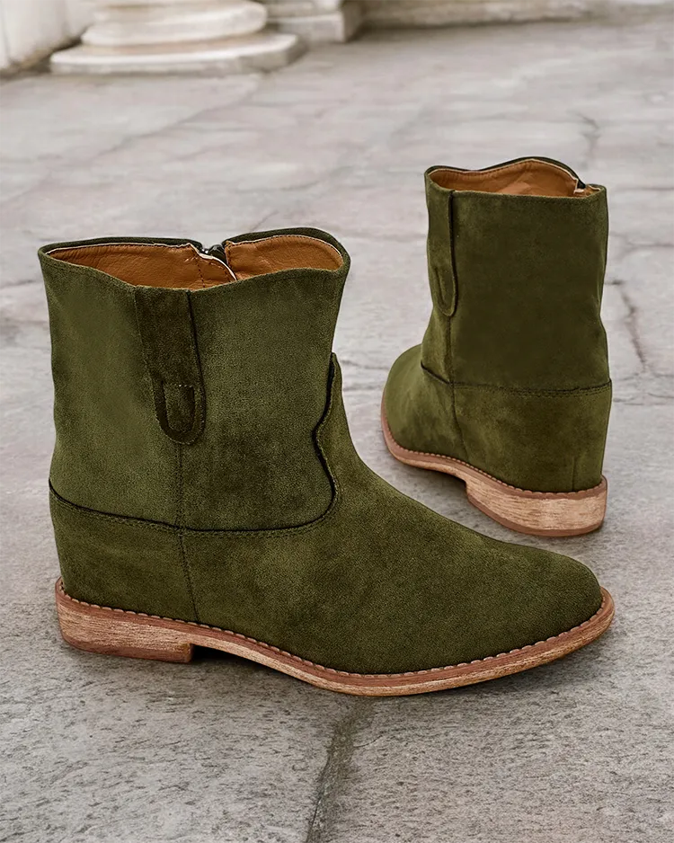 - Cizme stil cowboy în nuanțe de bej, realizate din eco-piele asemănătoare cu catifeaua. Modelul are căptușeală interioară în formă de blană moale. Pantofi pe un toc acoperit cu platformă redus. Pantofii se închid cu un fermoar.
