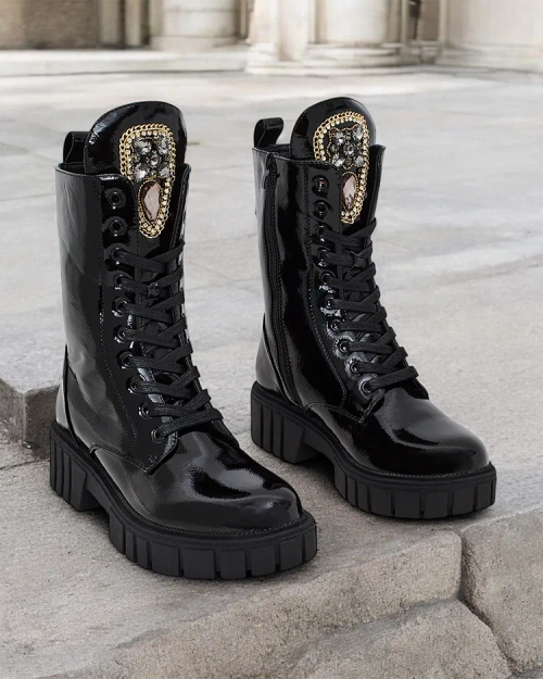 - Cizme elegante de tip bagger realizate din piele lăcuită. Cizmele sunt cu șiret au și o închidere cu fermoar . Modelul are o talpă mai groasă și umplutură de blană. Ideale pentru toamnă!