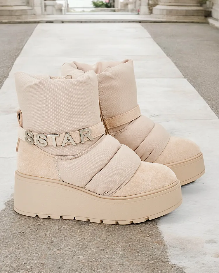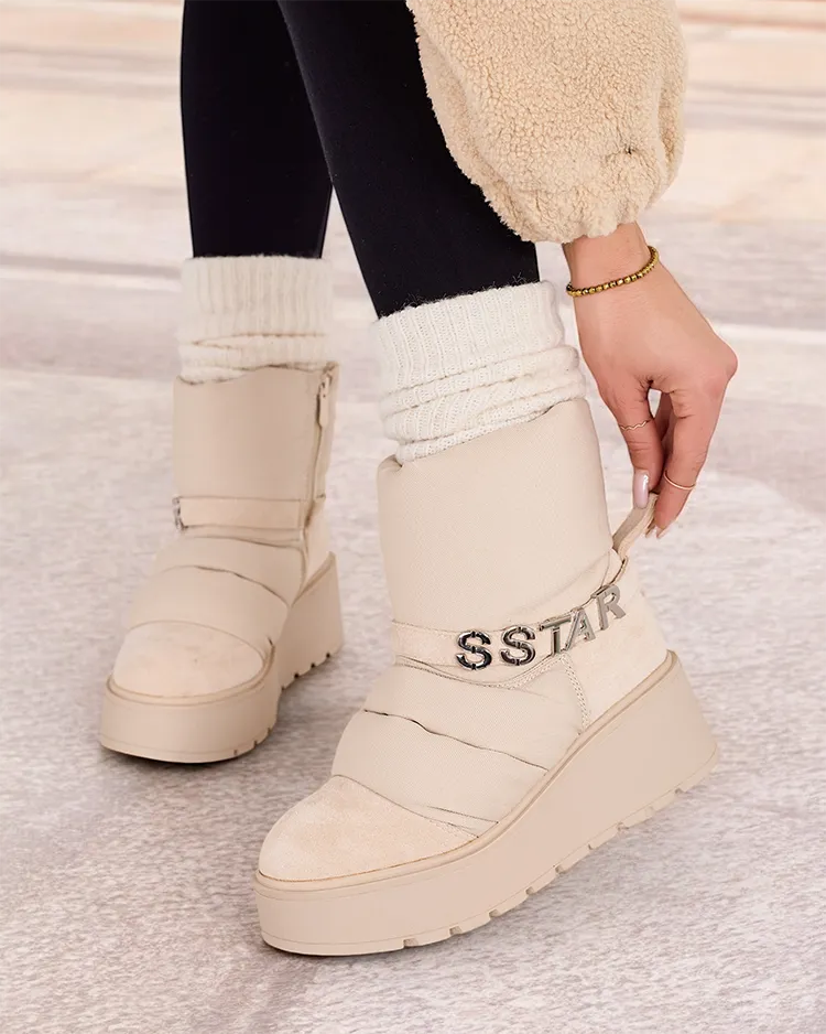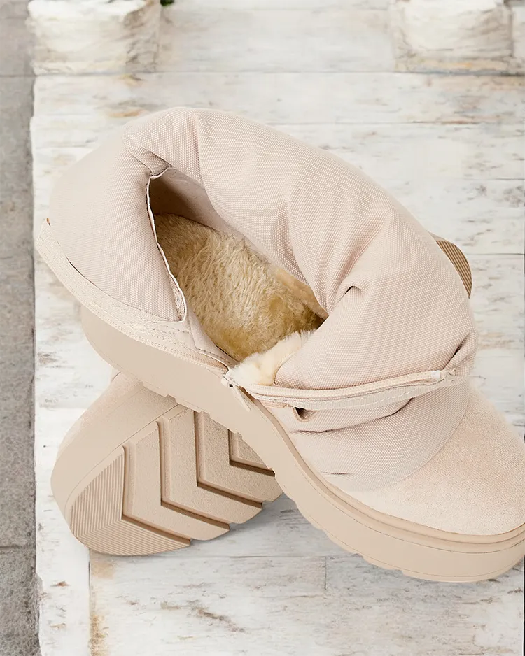 - Cizme de zăpadă pentru femei cu partea superioară realizată dintr-o combinație de piele ecologică de căprioară și material textil. Blănuri plăcute în interior, încălțăminte slip-on și cu fermoar. Perfecte pentru iarnă!