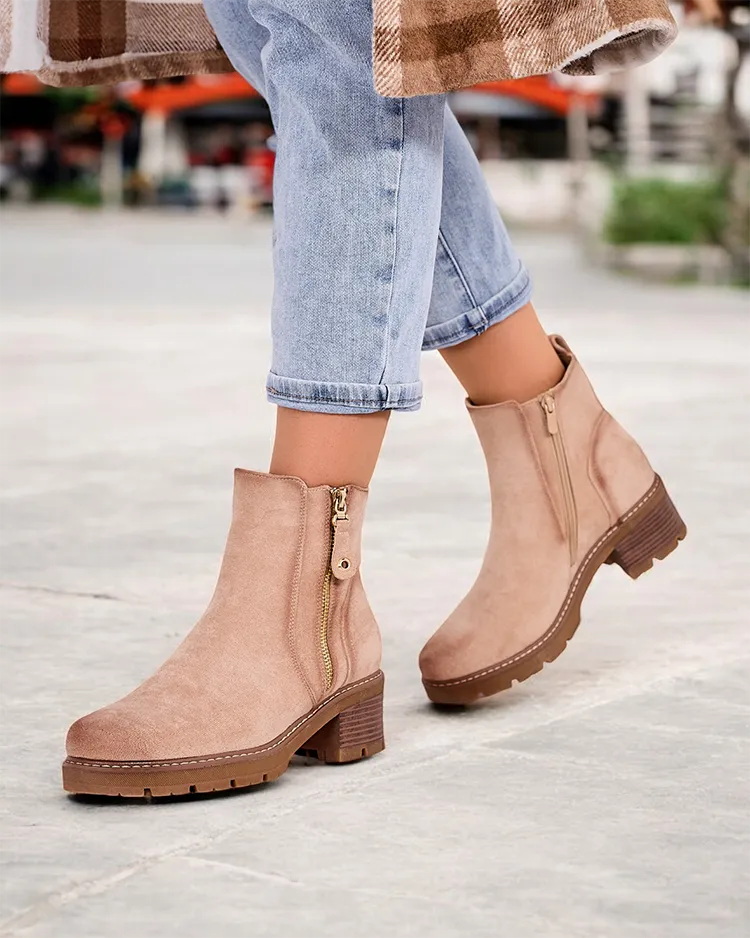 - Cizme de damă cu toc plat fabuloase, închise cu fermoar, confecționate din piele ecologică de catifea. Interiorul căptușit cu blană delicată garantează confort și căldură chiar și în zilele mai reci. Modelul are fermoare decorative!