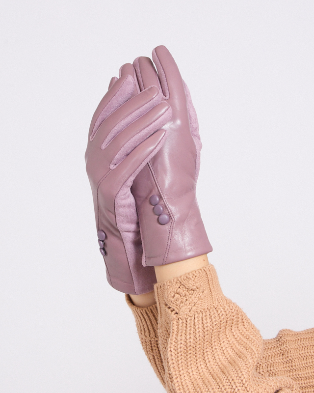 - Mănuși calde pentru femei, confecționate dintr-o combinație de piele eco și material textil. În interior, au o căptușeală subțire din blană. Un patch satinat pe degetul arătător permite operațiuni touchscreen.