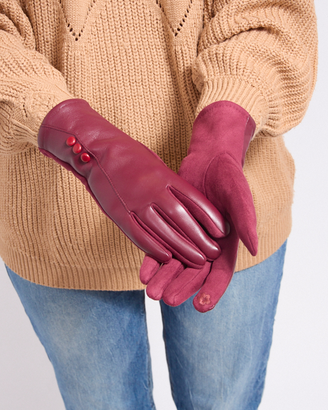 - Mănuși calde pentru femei, confecționate dintr-o combinație de piele eco și material textil. În interior, au o căptușeală subțire din blană. Un patch satinat pe degetul arătător permite operațiuni touchscreen.