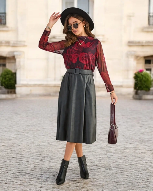 - Fusta midi pentru femei realizată din material asemănător cu pielea. Modelul are talie elastică și 2 buzunare. Bază perfectă pentru multe ținute unice! Modelul vine cu curea. ATENȚIE: Precizia măsurării (+/-) 1 cm.