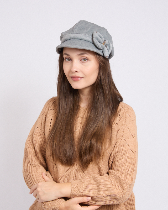 • Beret frumos pentru femei, cu o vizieră realizată dintr-un material plăcut la atingere, împodobit cu un fundiță. Un model clasic care va completa perfect stilizările de toamnă!