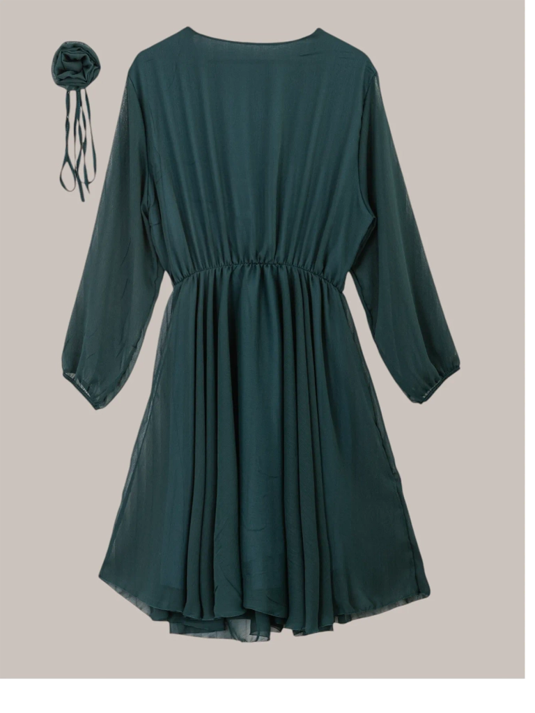 - 07198 Rochie clasică pentru femei de genunchi Royalfashion Rochie elegantă și atemporală pentru femei, până la genunchi, cu un decolteu tip wrap și o talie elastică. Rochia are mâneci lungi din plasă și o curea adițională decorativă cu o floare. O alegere