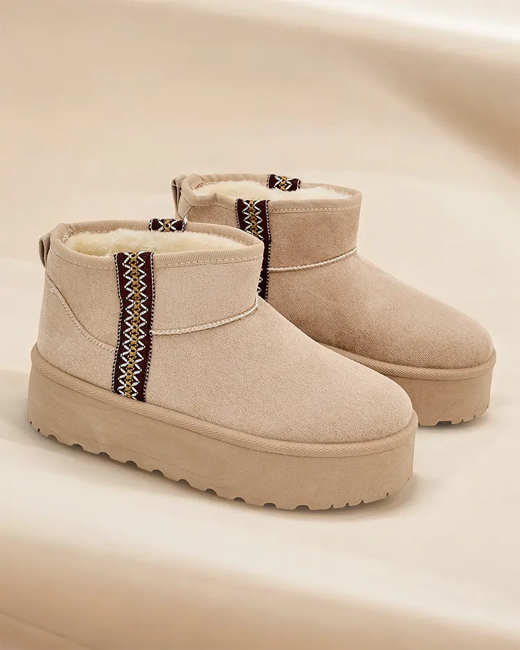 - Cizme de iarnă pentru femei minunate pe o platformă. Partea superioară este confecționată din piele sintetică de catifea, iar interiorul este căptușit cu blană artificială. Baza perfectă pentru iarnă!