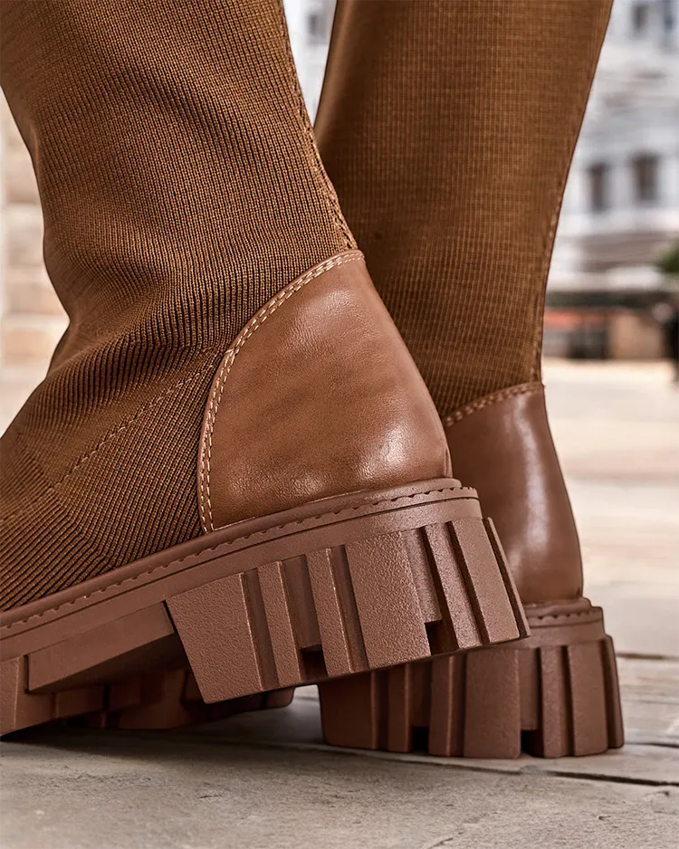 - Cizme peste genunchi elegante pentru femei cu o talpa mai groasa. Partea superioara este realizata din material textil flexibil cu insertii din piele ecologica, captuseala interioara din material textil. Model fara sireturi. Perfecte pentru tinutele de to