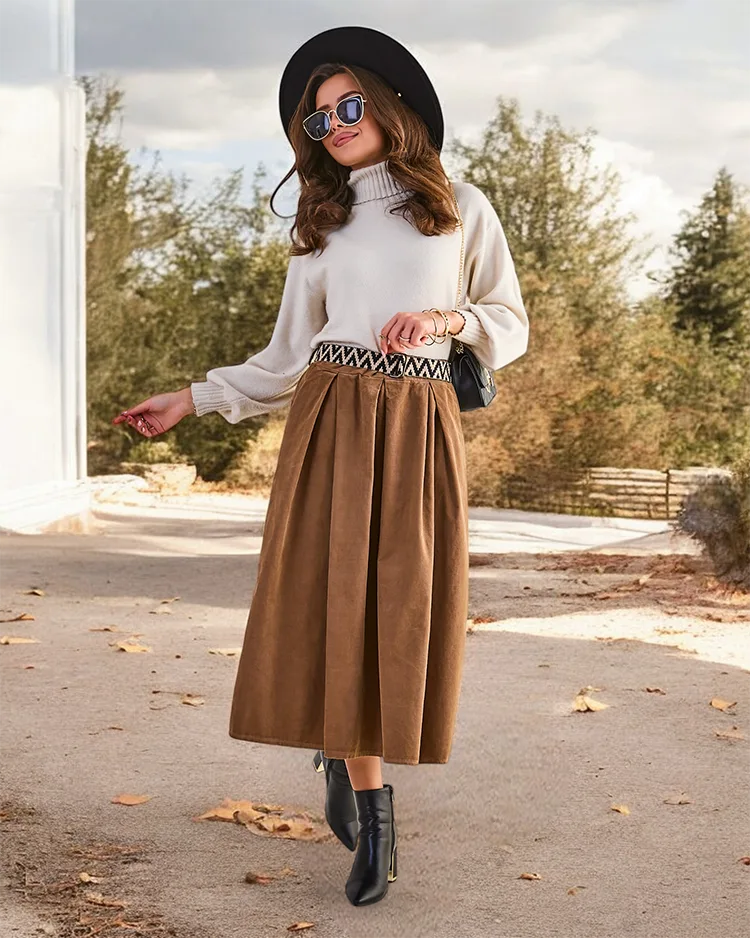 - Fustă midi pentru femei realizată dintr-un material moale similar cu catifeaua. Modelul vine cu o curea. O bază ideală pentru multe ținute unice! NOTĂ: Precizia măsurătorilor (+/-) 1 cm.