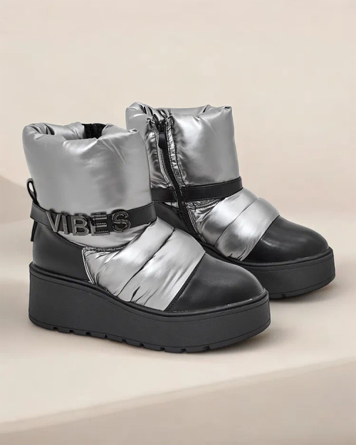 - Cizme de zăpadă pentru femei cu partea superioară confecționată dintr-o combinație de material similar cu pânza cerată și piele ecologică. În interior, există o căptușeală plăcută din blană, încălțămintea este de tip slip-on și are fermoar. Perfecte pentr