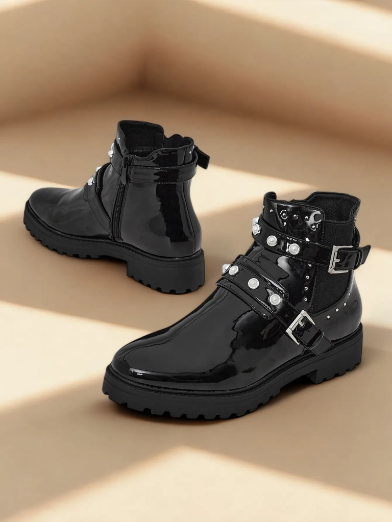 - Ghete elegante din piele lacuita. Incaltaminte inchisa cu fermoar, cu talpa mai groasa, cauciucata si captuseala sub forma de blana delicata. Modelul este decorat cu ornamente elegante pe partea superioara. Poartale pentru un stil de toamna!