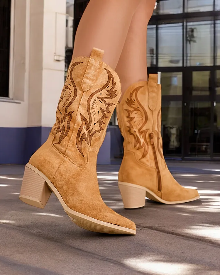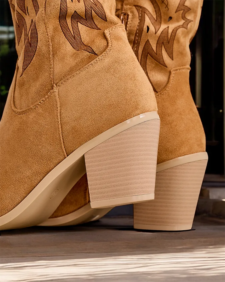 - Bocanci in stil cowboy cu toc, confectionati din piele ecologica din catifea. Captuseala din piele ecologica, incaltamintea inchisa cu un fermoar, decorata cu embosare. Se potrivesc multor stiluri feminine!