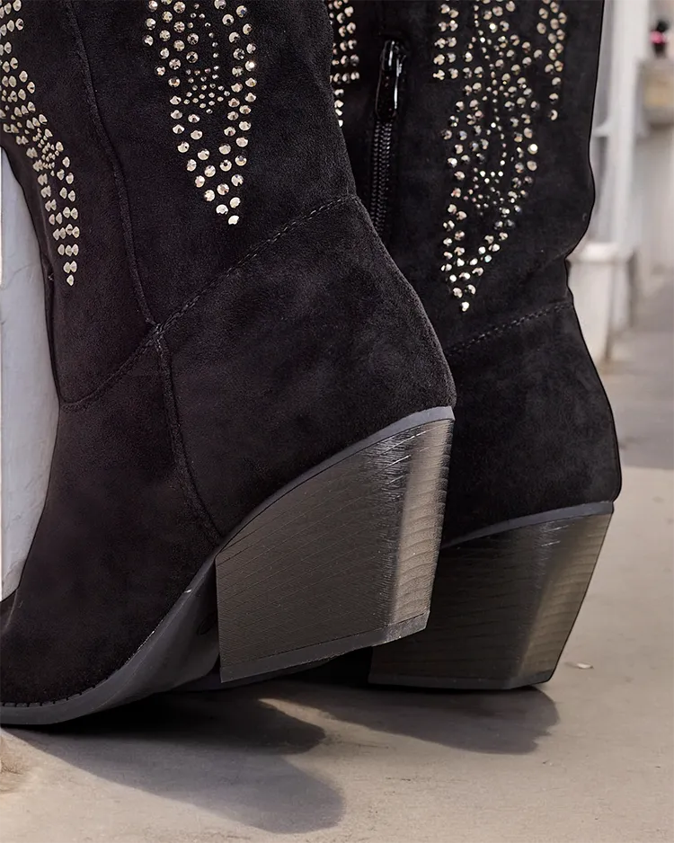 - Cizme care amintesc de stilul cowboy, fabricate din piele ecologica tip catifea. Branțul din piele ecologica, încălțările sunt închise cu fermoar, decorate cu zirconi. Se potrivesc multor stilizări feminine!