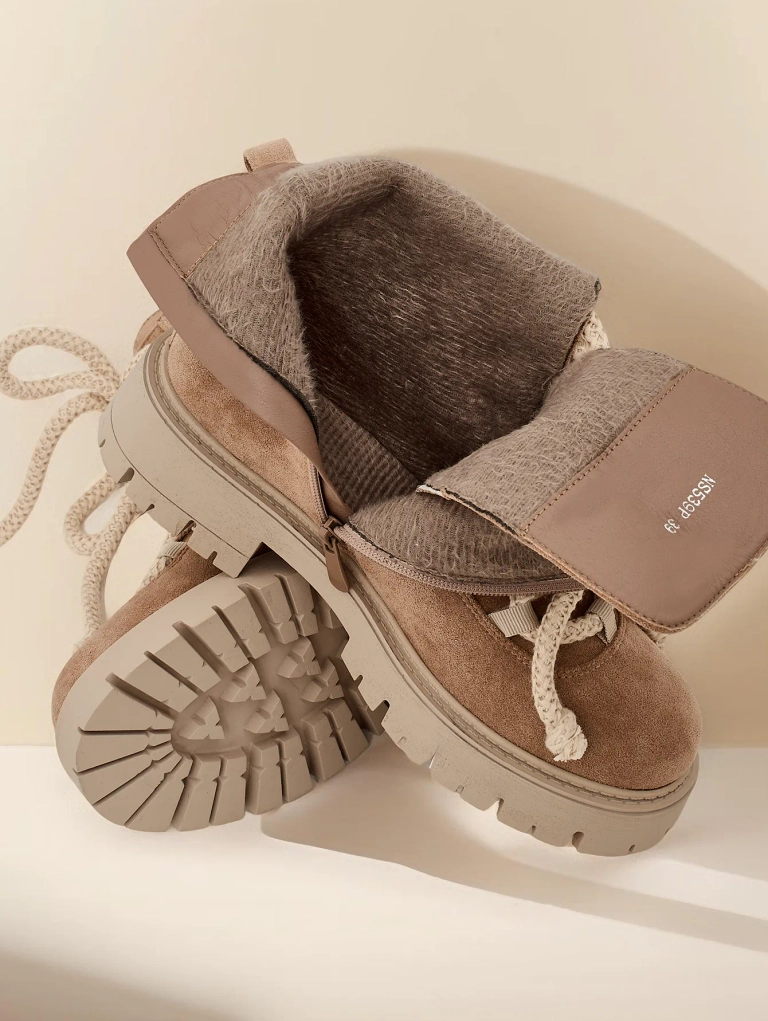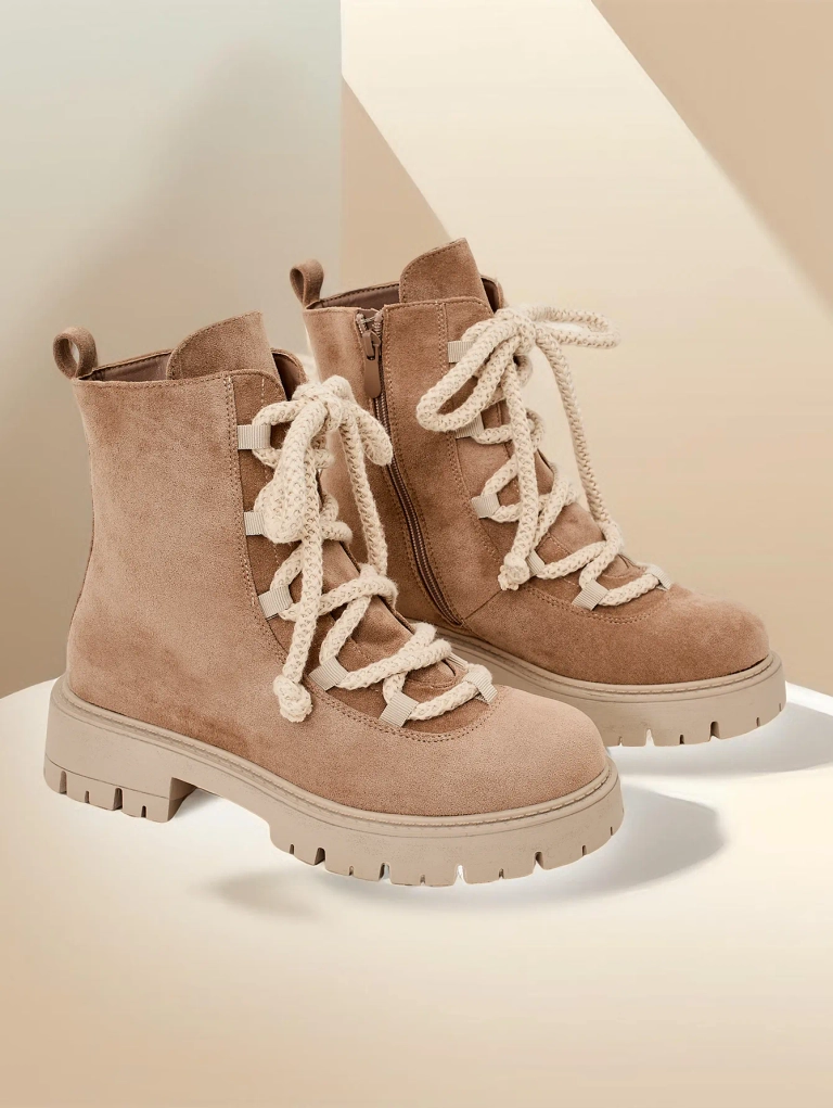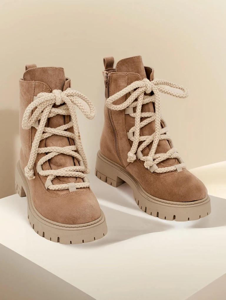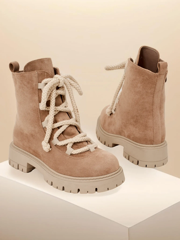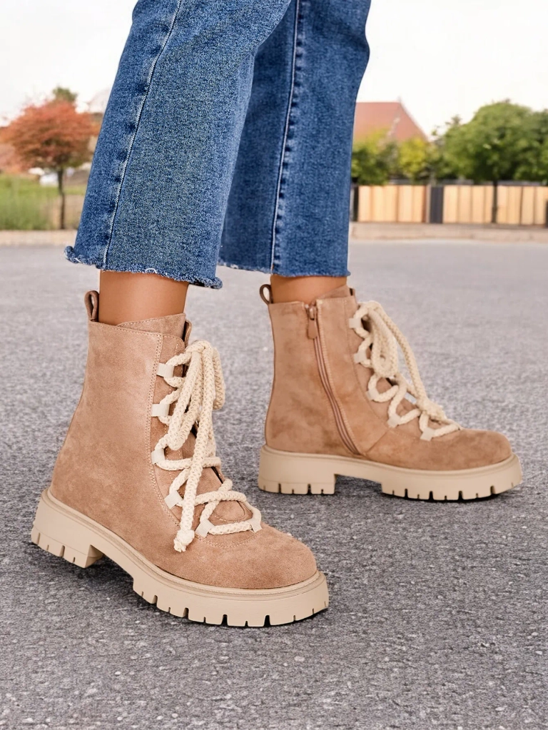 - Cizmele elegante de glezna cu sireturi, realizate din piele intoarsa ecologica. Incaltamintea are siret si fermoar. Modelul are o talpa mai groasa si captuseala din blana. Perfecte pentru toamna!
