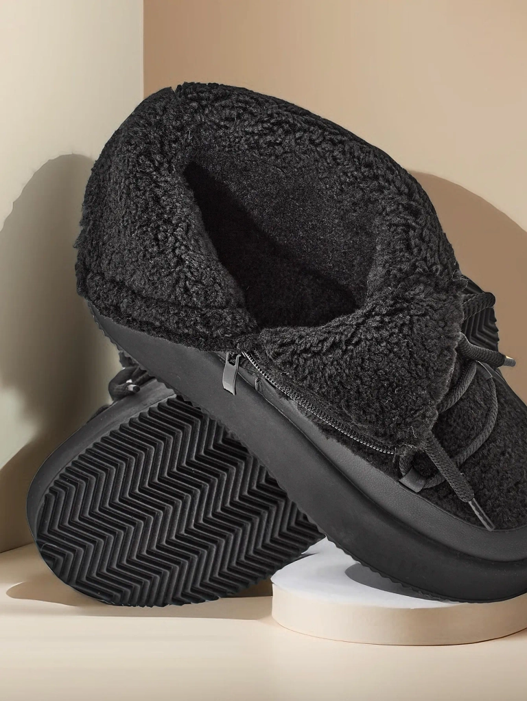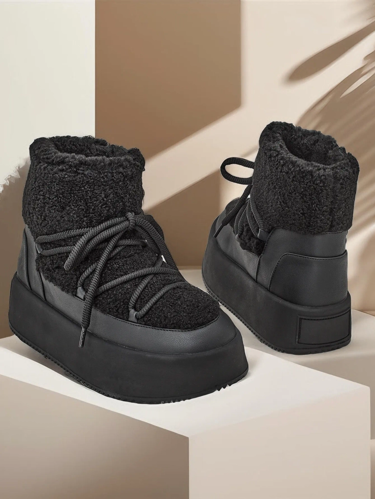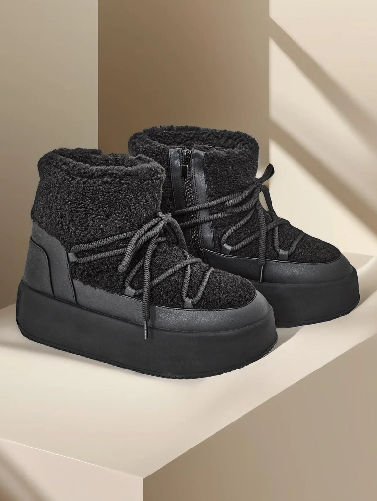 - Cizme de zăpadă pentru femei cu un tălp dintr-o combinație de piele eco și material plăcut. În interior, există o căptușeală plăcută din blană, încălțările au un fermoar și un tălp cu șiret. Perfecte pentru iarnă!