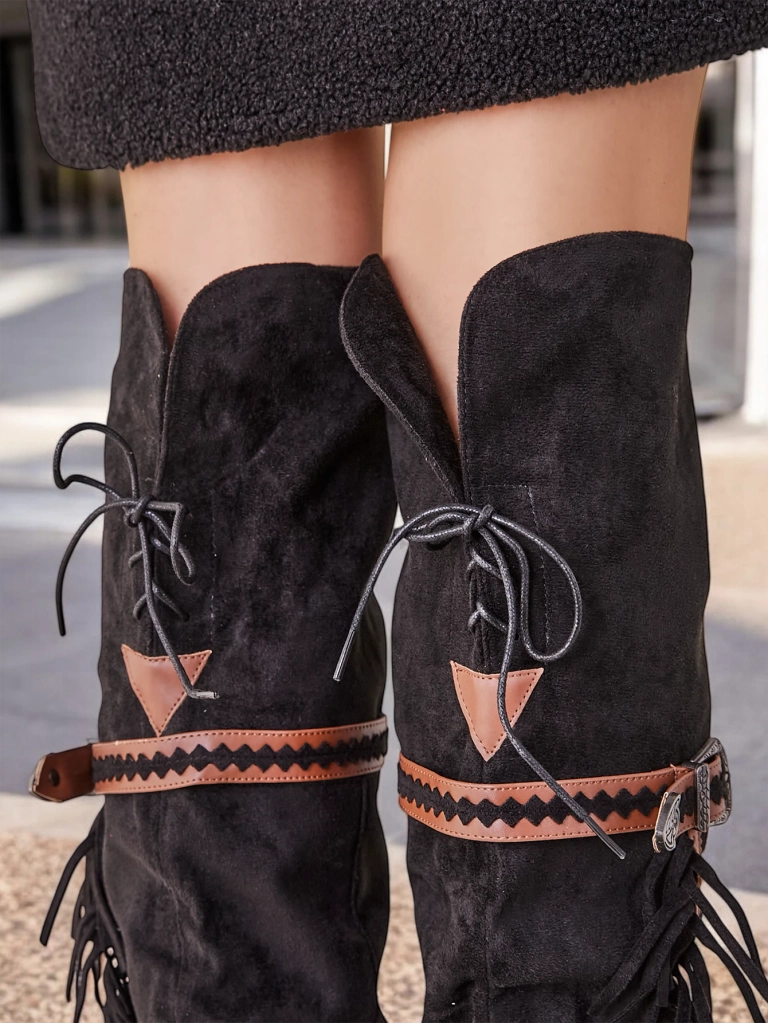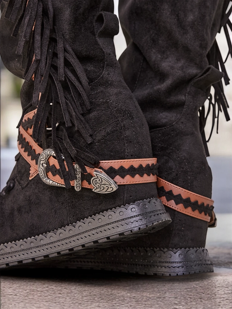 - Ghete elegante peste genunchi pentru femei cu toc ascuns cu platformă. Partea superioară este confecționată din piele eco-suede. Captuseală din material textil. Model slip-on, decorat cu franjuri și curele embosate.