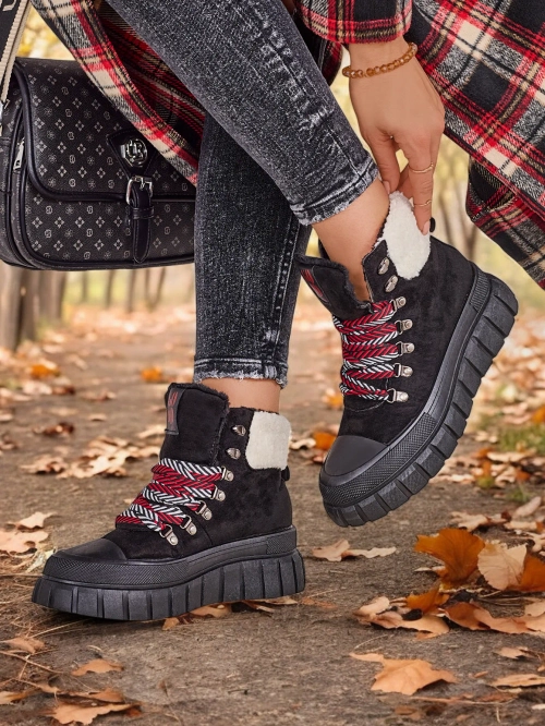 - Trapery de trekking pentru femei cu partea superioară înnodată. Materialul este din piele eco de catifea. Interiorul pantofilor este izolat cu blană. Perfecte pentru sezonul de iarnă!