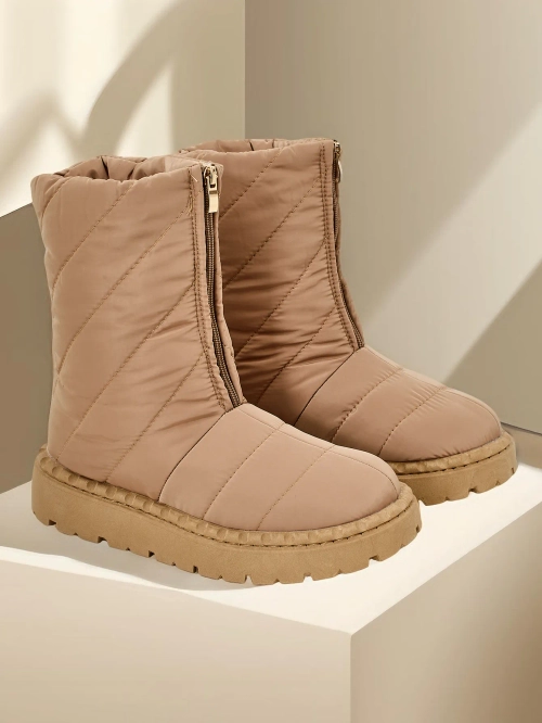 - Cizme de zăpadă pentru femei cu parte superioară realizată dintr-un material similar ceratei. În interior, există o căptușeală din blană, iar încălțămintea are un fermoar în mijloc. Perfecte pentru sezonul rece!