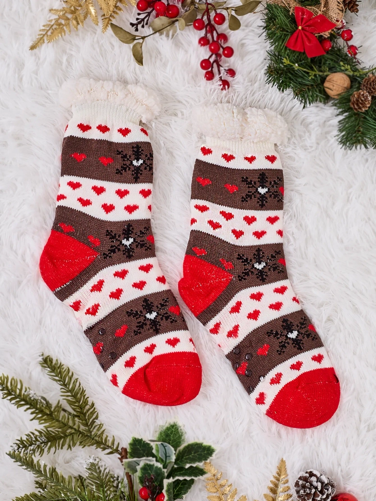 - Frumoase șosete groase pentru femei, decorate cu un imprimeu de sărbătoare. În interior sunt căptușite cu blană albă și călduroasă. Șosetele sunt perfecte pentru serile reci de iarnă!