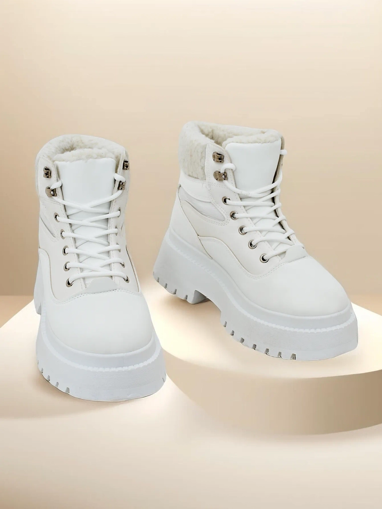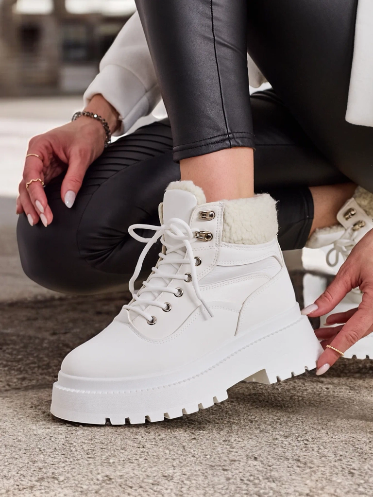 - Cizme de zăpadă clasice pentru femei, cu talpă groasă. Partea superioară este confecționată din piele ecologică. În interior, sunt căptușite cu blană și se leagă cu șireturi. Perfecte pentru anotimpurile mai reci!