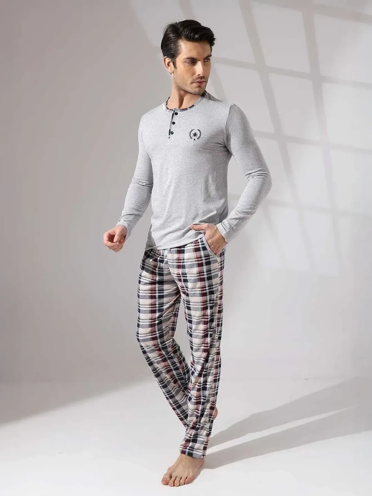• Pijamale elegante pentru bărbați cu un imprimeu unic și pantaloni carouri. Fabricate din bumbac de înaltă calitate, acestea garantează un somn confortabil și un aspect stilat. ATENȚIE: Precizia măsurătorilor (+/-) 1 cm.