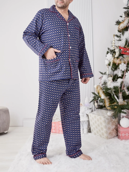 • Pijamale de bărbați cu un imprimeu la modă, fabricate din material de bumbac. Modelul are mâneci lungi și pantaloni. Partea de sus se închide cu nasturi. Confort și eleganță într-un singur produs!