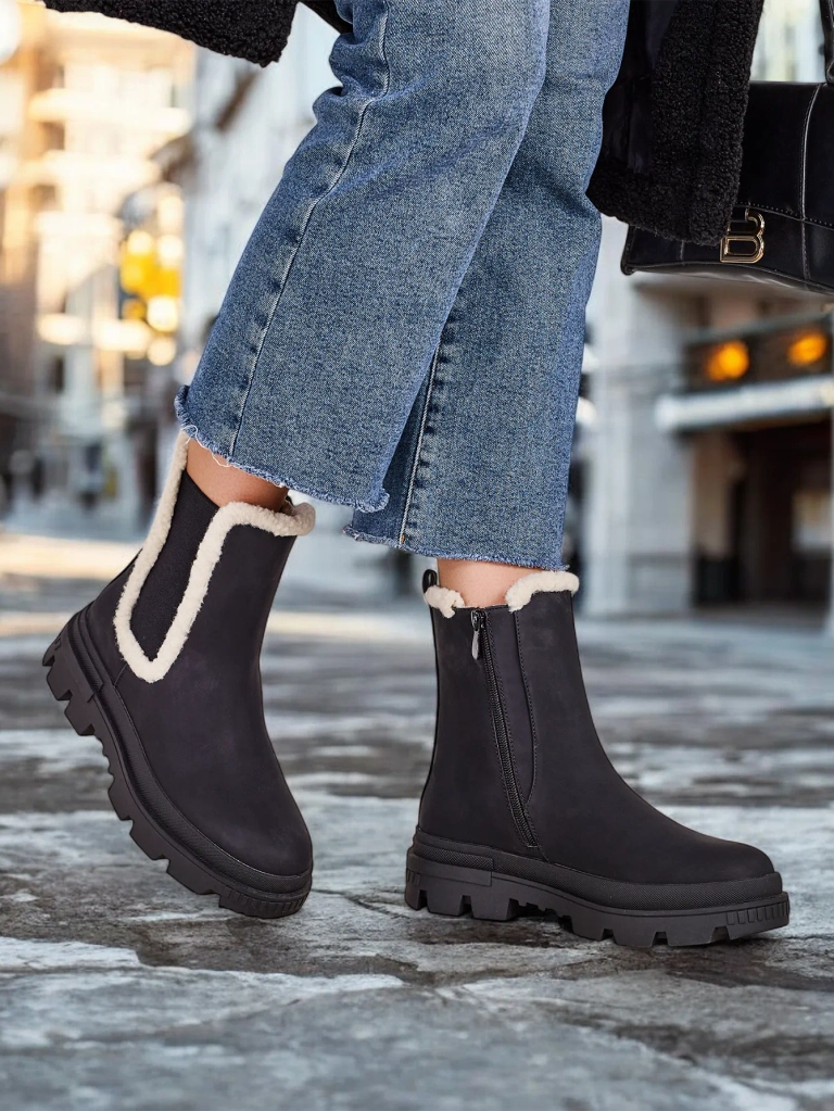 - Cizme super elegante pentru femei cu captuseala decorativa din blana. Realizate din piele ecologica mata. Talpa mai groasa ofera confort la fiecare pas. O alegere excelenta pentru toamna!