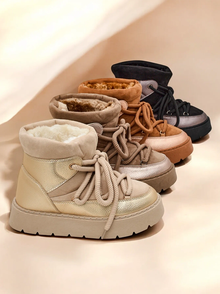 - Cizme de zapada pentru femei cu un shaft fabricat dintr-o combinatie de piele ecologica si piele intoarsa ecologica. Interior confortabil cu blana, incaltaminte cu slip-on si sireturi. Perfecte pentru iarna!
