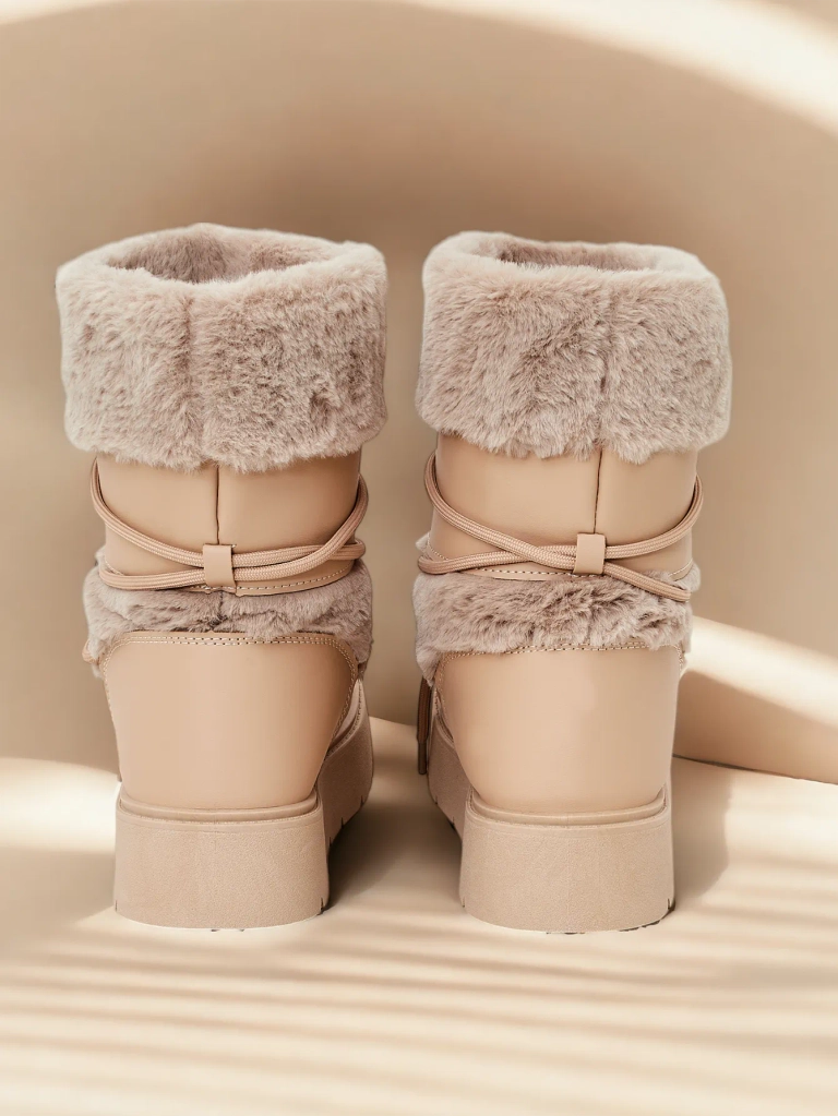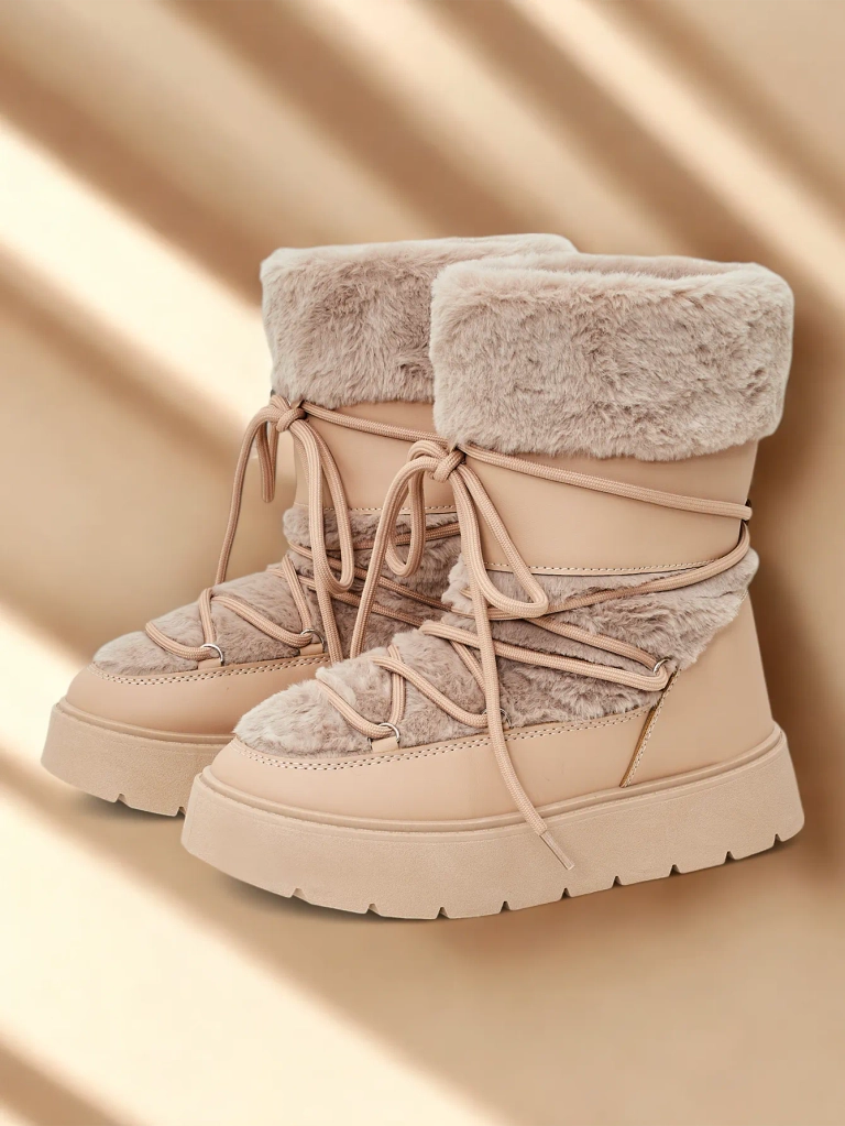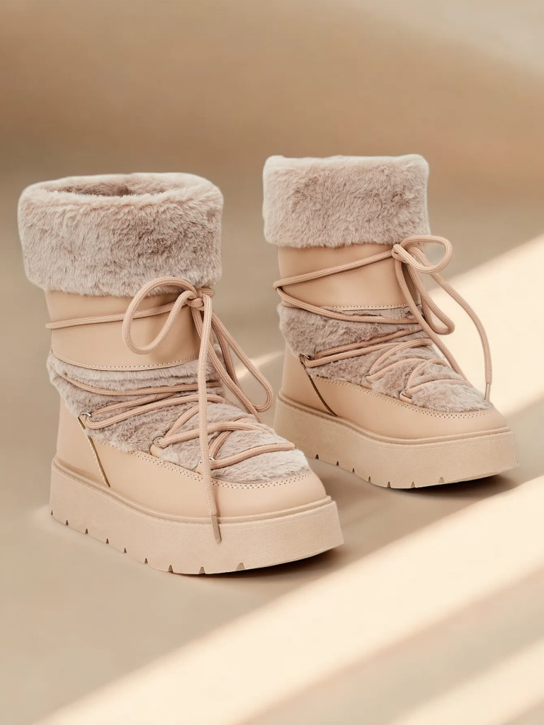 - Bocanci pentru femei de tip zăpadă cu un șaft făcut dintr-o combinație de eco-piele și material plăcut. În interior, există o căptușeală plăcută din blană, încălțămintea are un șaft înnodat. Perfect pentru iarnă!